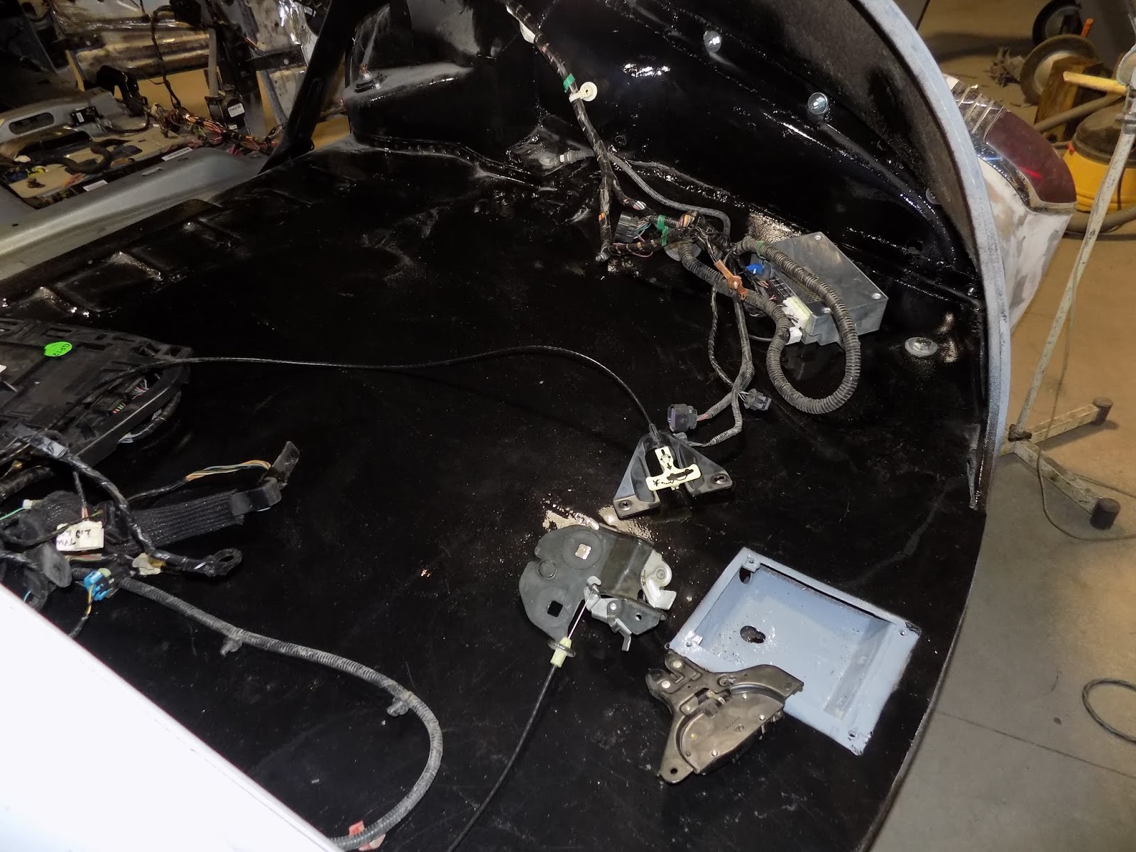 That is wanting on the backside of the trunk space with the decrease latch hanging down additional than I needed it to however you may see the brackets that have been fabricated to assist the latch. The handbook pull cable is on the far aspect.